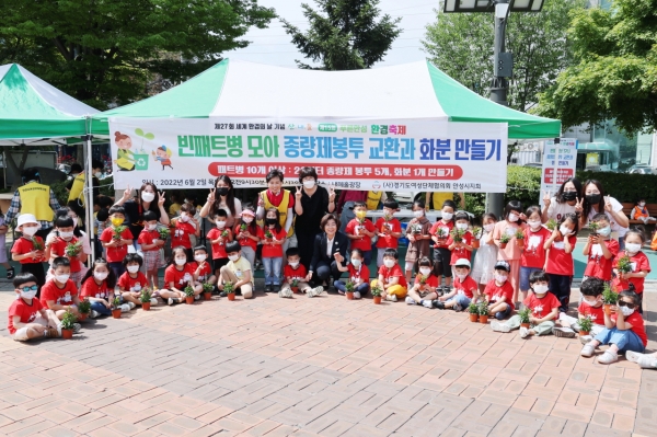 이날 행사에서 시민들이 페트병 10개를 가져오면 종량제봉투로 교환해주고 가져온 페트병을 재활용해 화분을 만드는 체험을 진행했다.