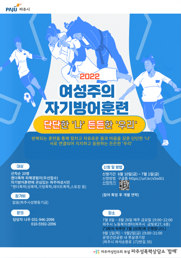 이 프로그램은 2022년 파주시 성평등기금 공모사업 선정단체 중 하나인 파주성폭력상담소 ‘함께’ 주관으로 진행되며 여성이 일상에서 마주하는 폭력상황에 대처하는 역량을 강화해 적극적인 대응을 할 수 있도록 하는 훈련이다.