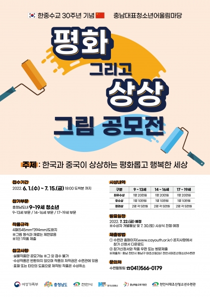 충청남도 거주 9~19세 청소년 누구나 참가할 수 있는 이번 그림공모전은 한-중수교 30주년의 의미를 되새겨 ‘한국과 중국이 상상하는 평화롭고 행복한 세상’을 주제로 진행된다.
