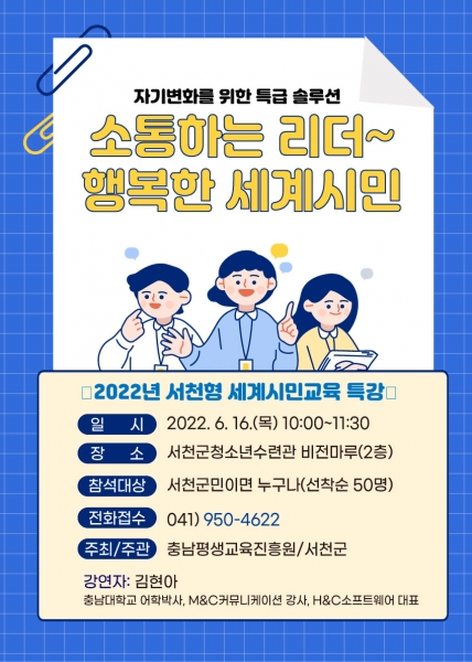 [금요저널] 서천군이 오는 16일 오전 10시에 서천군청소년수련관 비전마루에서 ‘자기변화를 위한 특급 셀프리더십’을 주제로 세계시민교육 특강을 개최한다고 밝혔다.