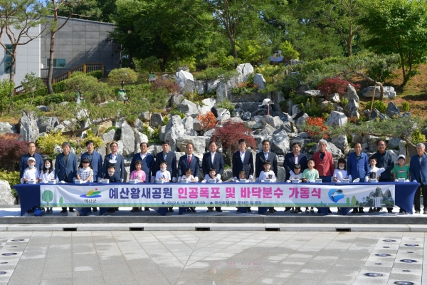 [금요저널] 예산군은 예산황새공원 내 인공폭포 및 바닥분수를 조성하고 지난 16일 가동식을 개최했다.