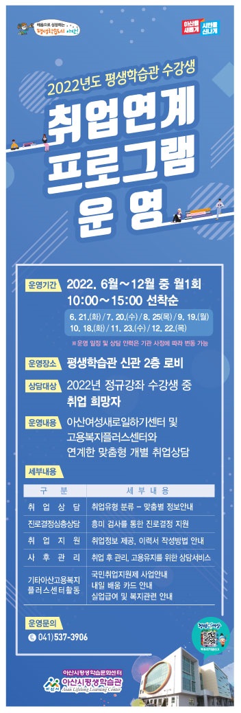 [금요저널] 아산시는 올해 12월까지 평생학습관에서 2022년도 수강생 취업 연계 활성화 프로그램을 운영한다.