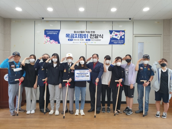 목공 지팡이는 아산시 청소년문화의 집을 이용하는 청소년 10여명이 아산시 국가유공자를 예우하기 위해 지난 4월부터 2개월 동안 목공기술을 습득해 직접 제작한 것으로 기부한 목공지팡이는 고령의 거동이 불편한 관내 국가유공자에게 전달된다.