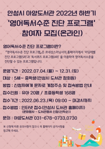 [금요저널] 안성시 아양도서관에서는 오는 23일부터 유아·초등·중학생을 대상으로 올 하반기 ‘영어독서수준 진단 프로그램’의 온라인 참여자를 모집한다.