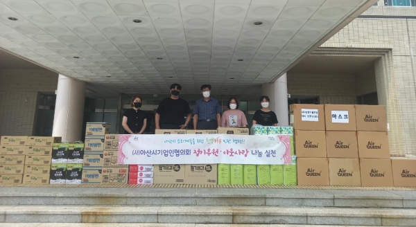 이날 행사에는 아산시기업인협의회 회원사인 8개 업체 ㈜프레스코, ㈜동원제관, 에이티이엔지, ㈜열린문디자인, ㈜천지건업, 신성산자, 태평양에어콘트롤공업, ㈜삼아인터내셔날가 참여해 즉석밥, 김, 라면, 휴지, 과자, 두유 등을 후원했다.