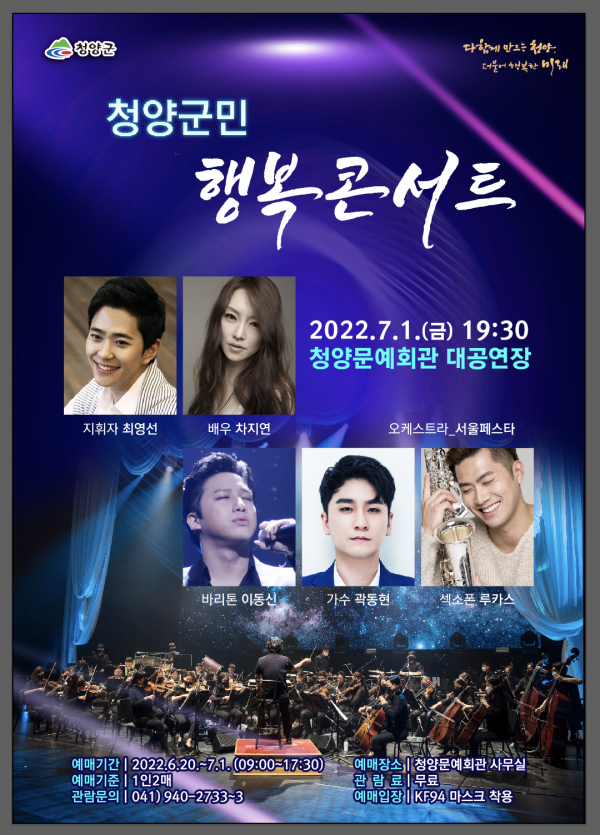 [금요저널] 청양군은 군민의 소통과 화합을 담은 ‘청양군민 행복 콘서트’를 오는 7월 1일 저녁 7시 30분 청양문예회관 대공연에서 개최한다.
