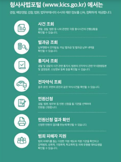 인터넷과 스마트폰 앱을 통해 회원가입, 로그인, 본인인증을 거쳐 사건 진행상황 조회, 벌과금 납부 조회, 온라인 민원 신청 등 서비스를 제공한다.