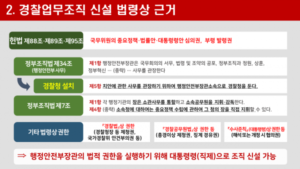 특히 행정안전부장관은 입장문 발표 이후 별도의 발표자료를 활용해 경찰업무조직 신설 관련 구체적 사안에 대한 입장을 다음과 같이 설명했다.