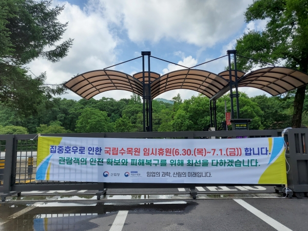 [금요저널] 산림청 국립수목원은 집중호우로 인한 관람객의 안전확보와 피해복구를 위해 이틀간~7.1.) 임시휴원 한다고 밝혔다.