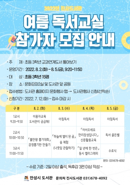 안성시 진사도서관, 여름 독서교실 참여자 모집