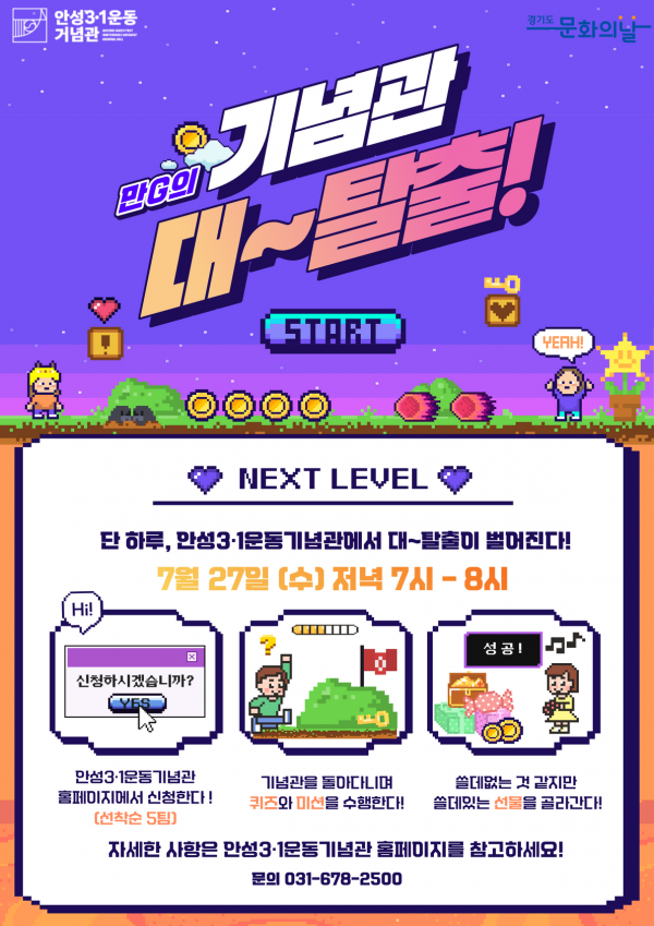 7월 27일 단 하루, 안성3.1운동기념관에서 벌어지는 ‘만G의 기념관 대~탈출에 참여를 원하는 자는 7월 15일 오전 10시부터 홈페이지를 통해 선착순으로 신청할 수 있다.