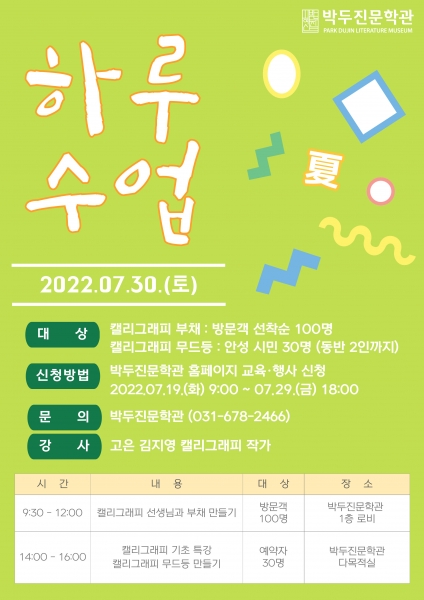 오후에는 사전 예약 프로그램인 ‘캘리그래피 무드등 만들기 수업’이 이어진다. 문학관 다목적실에서 캘리그래피 기초 특강을 수강한 후 종이 무드등을 만들어볼 수 있다. 수강인원은 30명이며 박두진문학관 홈페이지 ‘교육행사 신청’을 통해 7월 19일 오전 9시부터 29일 오후 6시까지 예약 가능하다.