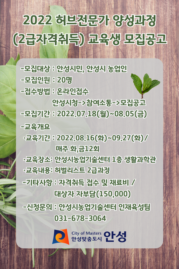 안성시, 허브전문가 양성 과정 교육생 모집