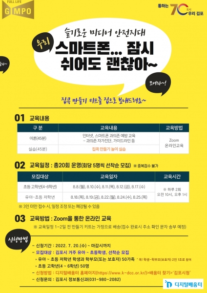 [금요저널] 김포시는 여름방학을 맞아 인터넷, 스마트폰으로 많은 시간을 보낼 유아, 초등학생을 대상으로 스마트폰 과의존 온라인 체험교육을 진행한다.