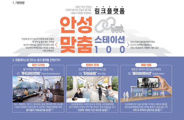 이날 설명회에서 시 관계자는 “‘안성역 스테이션 100’ 조성사업은 철도시대 개막에 대한 열정과 추진 의지를 나타내는 상징적 문화공간으로 철도 전시관, 공유레스토랑, AR체험존 등 다양한 콘텐츠가 가미된 문화공간으로 조성할 계획”이라고 밝혔다.