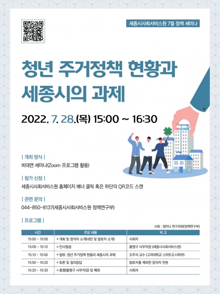 이와 관련해 세종시사회서비스원에서는 세종시 청년들의 안정적인 지역 정착 및 정주화를 위해 청년 주거 부문에서의 현황 및 정책에 대한 발표와 토론을 통해 논의할 예정이다.