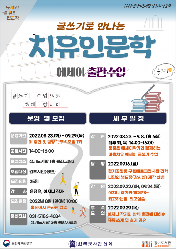 [금요저널] 김포시 장기도서관은 문화체육관광부 주최, 한국도서관협회 주관의 ‘2022년 도서관 길 위의 인문학’ 공모사업 선정에 따라 ‘글쓰기로 만나는 치유인문학’을 오는 8월 23일부터 9월 29일까지 김포시 성인 25명을 대상으로 운영한다.