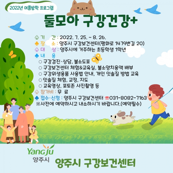 [금요저널] 양주시 구강보건센터는 오는 8월 26일까지 취학아동의 구강건강 예방·체험·교육 프로그램 ‘둘모아 구강건강+’을 운영한다.