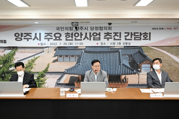 [금요저널] 양주시는 26일 시청 2층 상황실에서 민선 8기 공약사업의 원활한 추진과 국·도비 예산 확보를 위해 ‘2022년 제1회 당정협의회’를 개최했다.