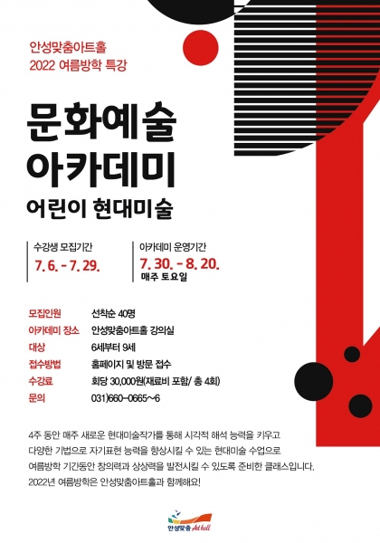 [금요저널] 안성시 안성맞춤아트홀은 여름방학을 맞은 아이들을 위해 창의력과 상상력이 돋보이는 현대미술을 쉽고 재미있게 만날 수 있는 2022 여름방학 특강 ‘어린이 현대미술’ 강좌를 개최한다.