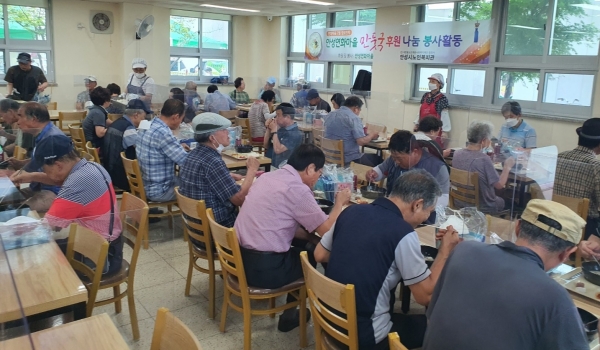 [금요저널] 안성시노인복지관은 지난 27일 지역 어르신들을 위한 봉사활동에 앞장서고 있는 마을공동체 안성연화마을과 7월 경로잔치 ‘해피 만둣국데이’를 진행했다.