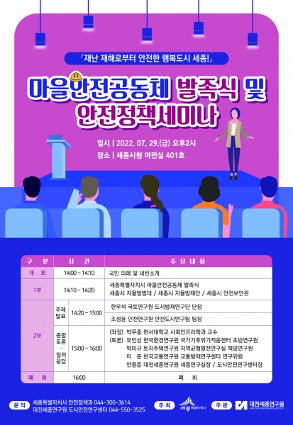 시는 29일 시청 여민실에서 ‘마을안전공동체 발족식’과 ‘재난·재해로부터 안전한 행복도시 세종을 위한 세미나’를 연계 진행했다.