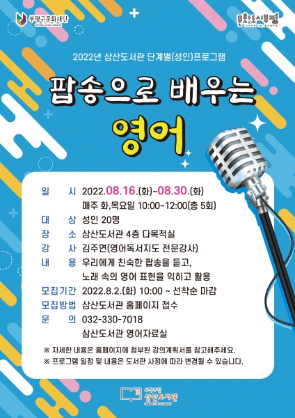 [금요저널] 부평구삼산도서관이 2일부터 성인을 위한 영어프로그램 ‘팝송으로 배우는 영어’ 참가자 20명을 선착순으로 모집한다.