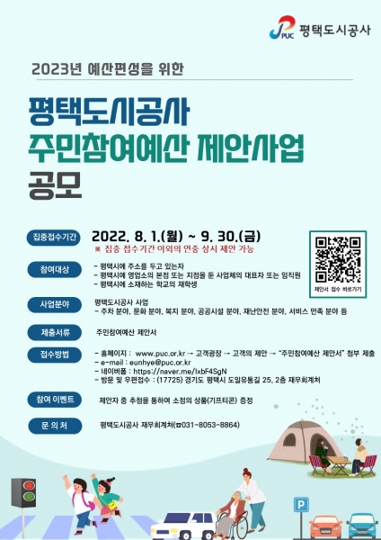 [금요저널] 평택도시공사가 연중 상시 제안 방식으로 운영중인 ‘2022년 주민참여예산제’ 공모 접수를 8월 1일부터 집중실시 한다고 밝혔다.