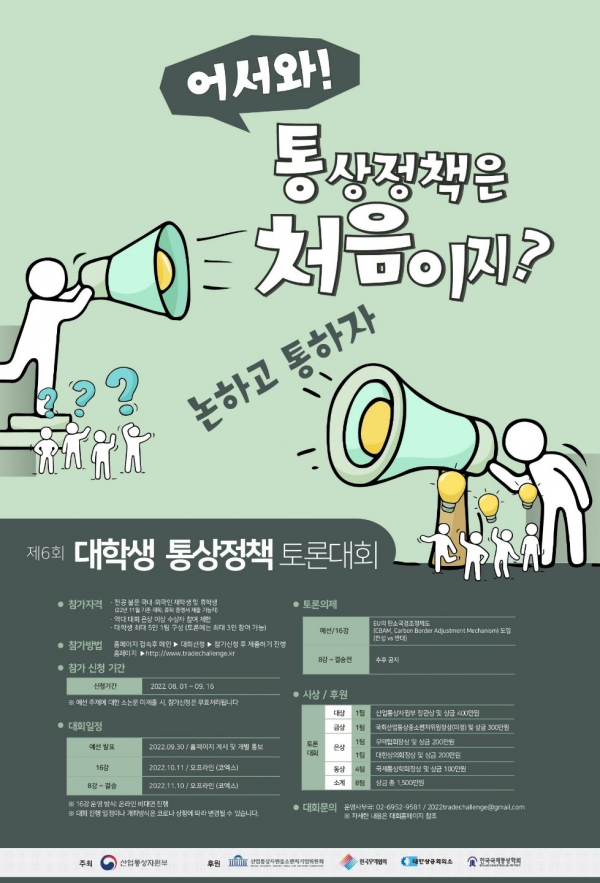 [금요저널] 산업통상자원부는 우리나라 통상 현안에 대해 미래 세대와 소통하고 통상 전문인력 양성을 위해 ‘2022년 대학생 통상정책 토론대회’를 개최한다.