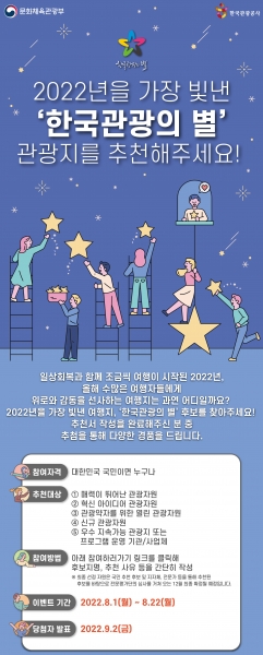 [금요저널] 문화체육관광부와 한국관광공사는 ‘2022 한국관광의 별’ 선정을 위한 후보 추천 이벤트를 8월 22일까지 3주간 실시한다.