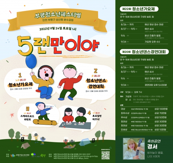 부평청소년페스티벌 ‘5랜만이야’는 오는 9월 24일 삼산동 분수공원에서 열리며 2년 만에 대면 축제로 진행하게 됐다.