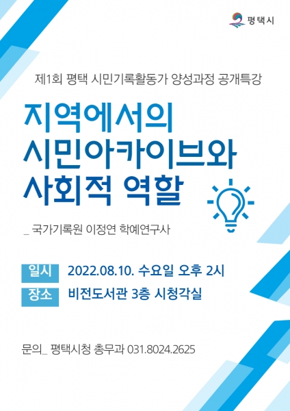 [금요저널] 평택시는 2022년 제1회 시민 기록활동가 양성과정 프로그램의 일환으로 오는 10일 오후 2시에 비전도서관에서 ‘지역에서의 시민아카이브와 사회적 역할’에 대한 공개특강을 진행한다.
