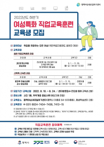 평택여성새로일하기센터, 2022년 하반기 직업교육훈련 교육생 모집