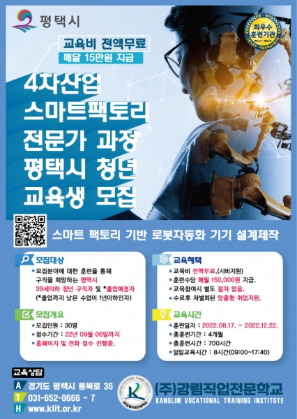 스마트 팩토리 과정은 “스마트 팩토리 기반 로봇자동화 기기 설계 제작 과정”으로 개설했고 모집 인원은 30명, 교육기간은 8월 17일부터 12월 22일까지 약 5개월간이며 신청 방법은 강림직업전문학교 인터넷으로 신청하거나 유선으로도 가능하다.
