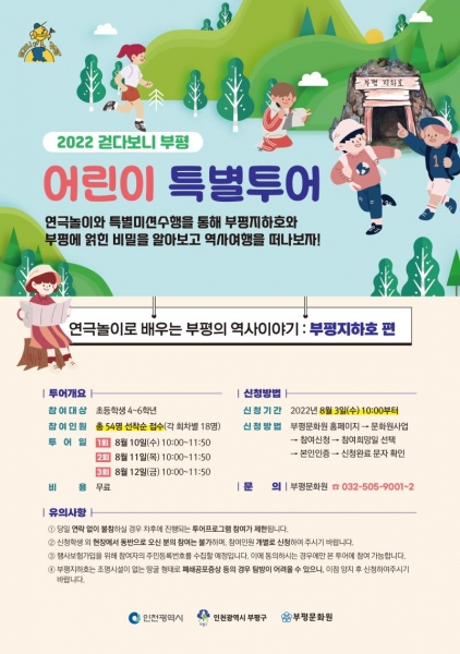 [금요저널] 부평구부평문화원이 오는 10일부터 12일까지 초등학교 고학년 어린이를 대상으로 ‘2022 걷다보니 부평 어린이 특별투어’를 진행한다.