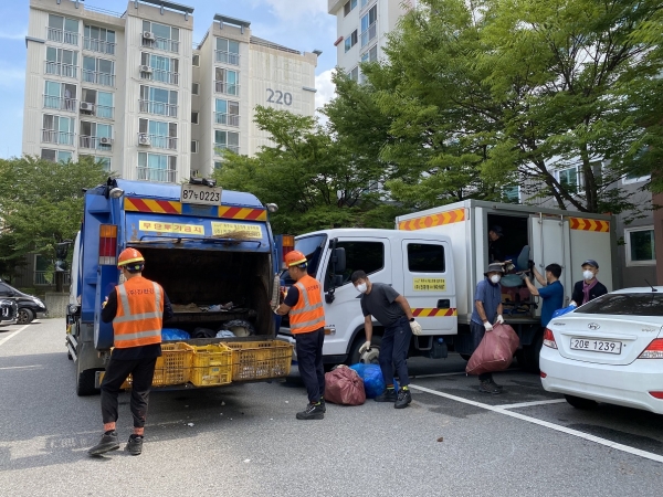 교하동 맞춤형복지팀으로부터 해당 어르신의 상황을 들은 ㈜진환경은 도움의 손길을 내밀어 집안을 가득 채운 쓰레기와 폐기물을 수거하고 내부 청소까지 봉사했다.