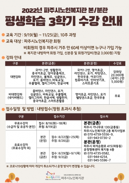 [금요저널] 파주시는 오는 16일부터 9월 1일까지 지역 어르신들을 대상으로 하는 평생학습 과정 수강생을 모집한다고 밝혔다.