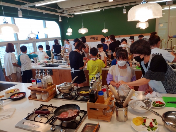 요리체험은 초등학생 자녀와 부모가 한 팀을 이뤄 셰프의 지도에 따라 스테이크, 파니니, 샥슈카 등 인기 있는 외국 요리를 직접 만드는 방식으로 진행했다.