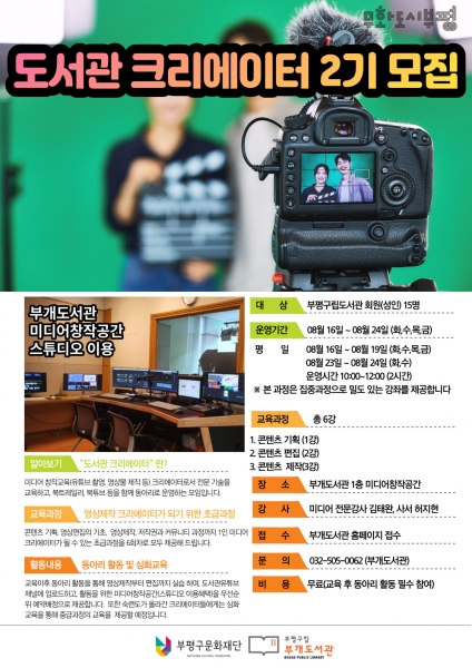 [금요저널] 부평구부개도서관이 오는 16일부터 24일까지 무료스튜디오 미디어 창작공간 ‘나래’에서 2022년 도서관 크리에이터 과정 2기를 진행한다.
