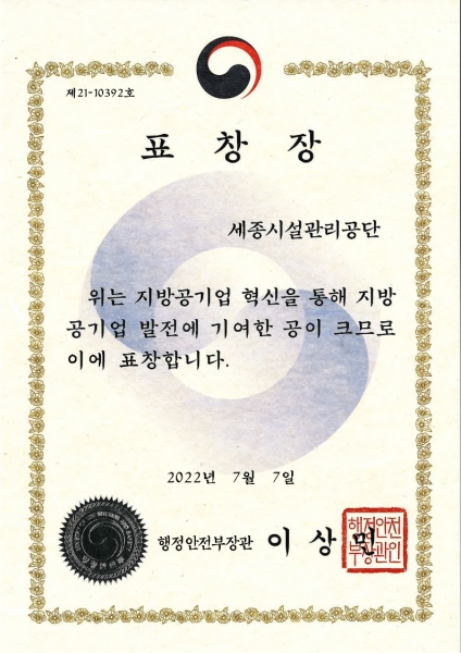 계용준 이사장은 “시설물 관리에 첨단기술을 적용하는 등 지속적인 혁신 노력에 대한 성과를 인정받아 매우 기쁘다”며 “앞으로도 세종시민을 위한 혁신 성과 창출에 최선을 다하겠다”고 밝혔다.