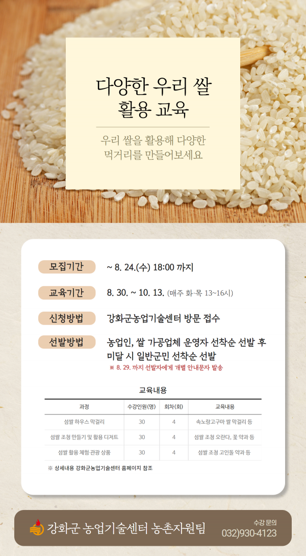 교육은 8월 30일부터 10월 13일까지 총 12회에 걸쳐 섬쌀 하우스 막걸리 섬쌀 조청을 활용한 디저트 섬쌀을 활용한 체험상품 등으로 실습 중심으로 진행된다.