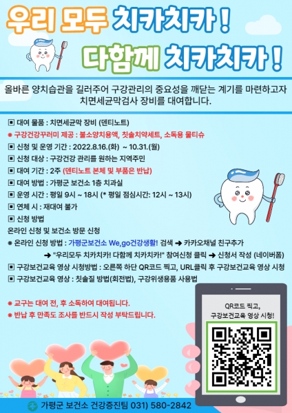 [금요저널] 가평군 보건소는 코로나 19로 구강건강 관리가 어려운 시기에 온 가족이 가정에서 함께 치면세균막 검사기 대여를 통해 칫솔질 실천율을 높여 청결하고 건강한 구강위생 환경을 도모하고자 오는 8월 16일부터 10월 31일까지 ‘우리 모두 치카치카 다함께 치카치카’ 프로그램을 운영한다.