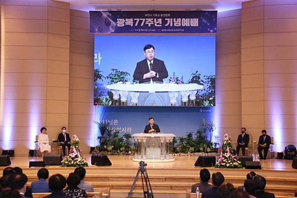 김승민 총회장은 “77년 전 국권을 빼앗겨 어둠 속에 있던 한반도에 빛을 보내주신 하나님께 감사드린다.