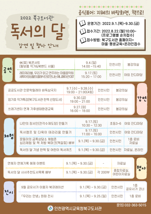 [금요저널] 인천광역시교육청북구도서관은 9월 독서의 달을 맞아 ‘지혜의 바탕화면, 책으로’라는 공식 슬로건으로 도서관 이용자 및 지역주민을 위한 다양한 독서문화프로그램을 운영한다.