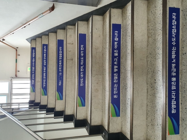[금요저널] 여주시 수도사업소는 전 직원이 일상속에서 친절봉사와 청렴행정을 생활화하기 위한 실천으로 청사에 ‘친절·청렴계단’을 새단장했다 민선8기 여주시정 방침 중 ‘시민 만족 행정서비스’에 발 맞추어 1층 계단에는 수도사업소를 방문하는 시민에게 환영 인사와 함께 친절다짐 문구를, 2층 계단에는 공정한 직무수행과 공무원의 행동강령 마음가짐을 담은 청렴 문구를 부착해 ‘나와 시민과의 무언의 약속’ 의미를 담았다.