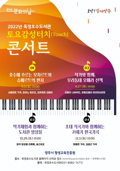 [금요저널] 양주시 옥정호수도서관은 2022년 ‘경기도 문화의 날’ 주간에 시민들에게 다채로운 문화행사 체험 기회를 제공하기 위해 오는 9월부터 12월까지 ‘토요감성터치 콘서트’를 운영한다.