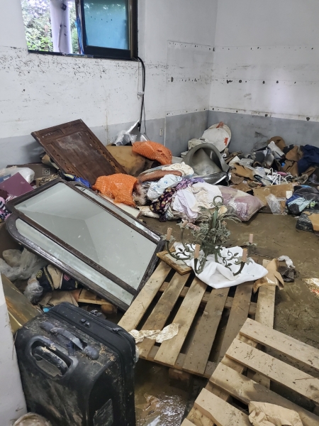 이날 봉사자들은 아침 일찍부터 침수된 지하창고에 있는 2t 분량의 폐기물과 쓰레기를 치우며 구슬땀을 흘렸다.