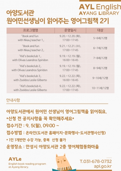 [금요저널] 안성시 아양도서관이 유아 및 초등학생을 대상으로 ‘AYL잉글리시-원어민 선생님이 읽어주는 영어그림책’ 2기 참여자를 모집한다.