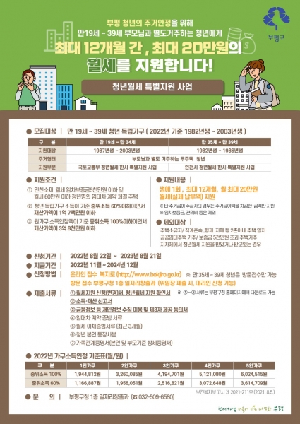 지원 대상은 부평구에서 거주하는 만 19세~39세의 저소득·무주택 청년 독립 가구며 소득 기준은 기준중위소득 60% 이하및 재산 1억700만원 이하다.