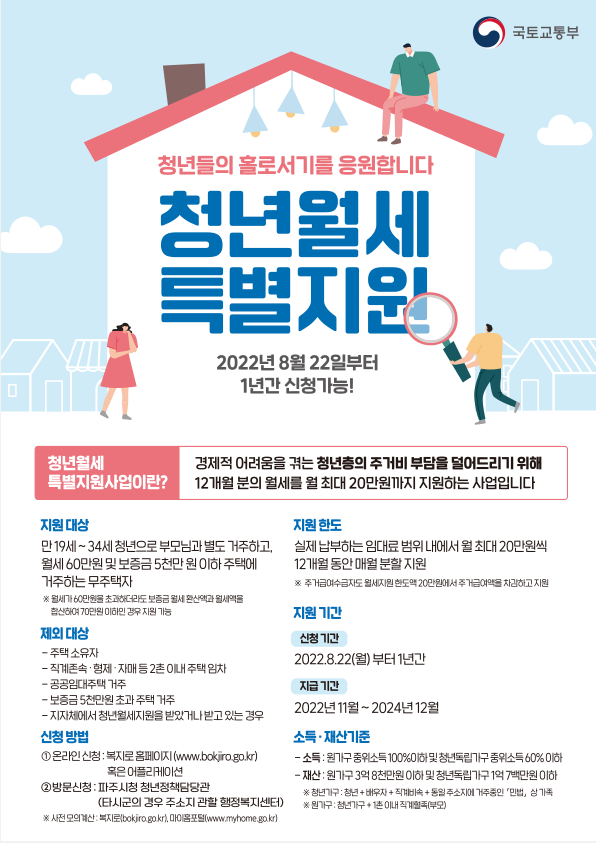 지원 대상은 만 19세~34세 이하로 부모님과 별도로 거주하고 임차보증금 5,000만원 및 월세 60만원 이하의 주택에 거주하는 무주택자로 청년 본인가구 및 부모를 포함한 원가구의 소득·재산 등을 고려해 지원 결정이 이뤄진다.